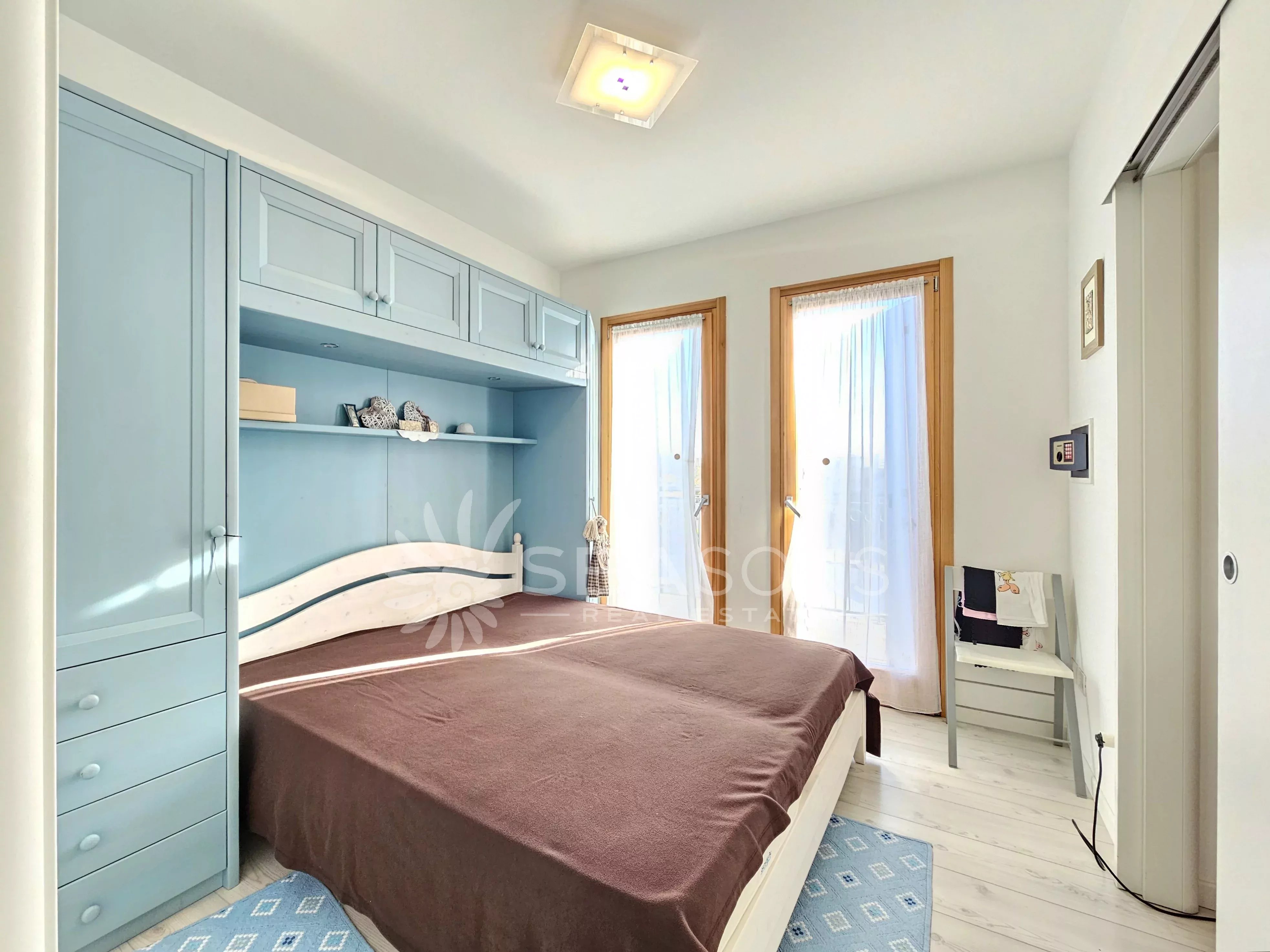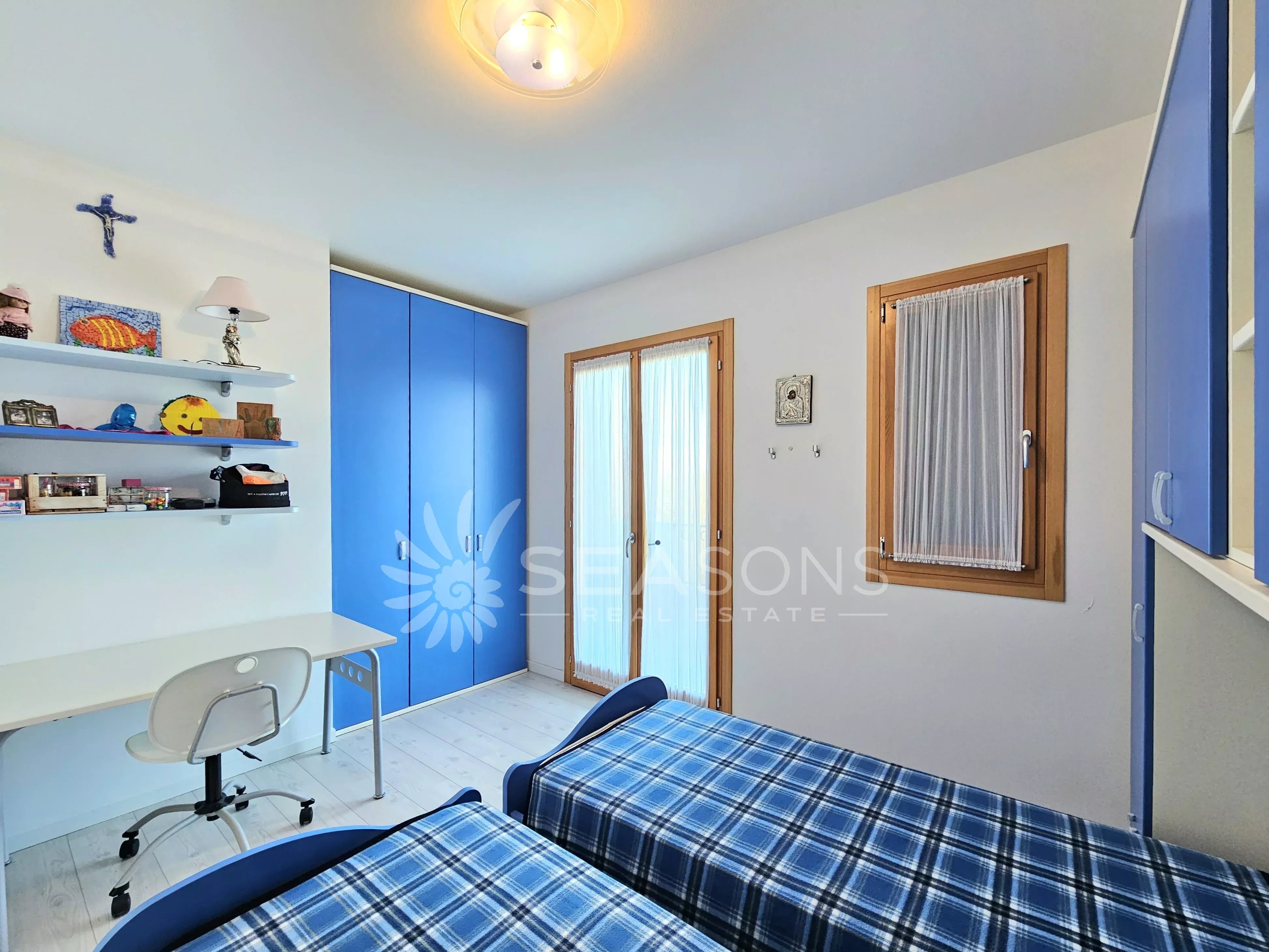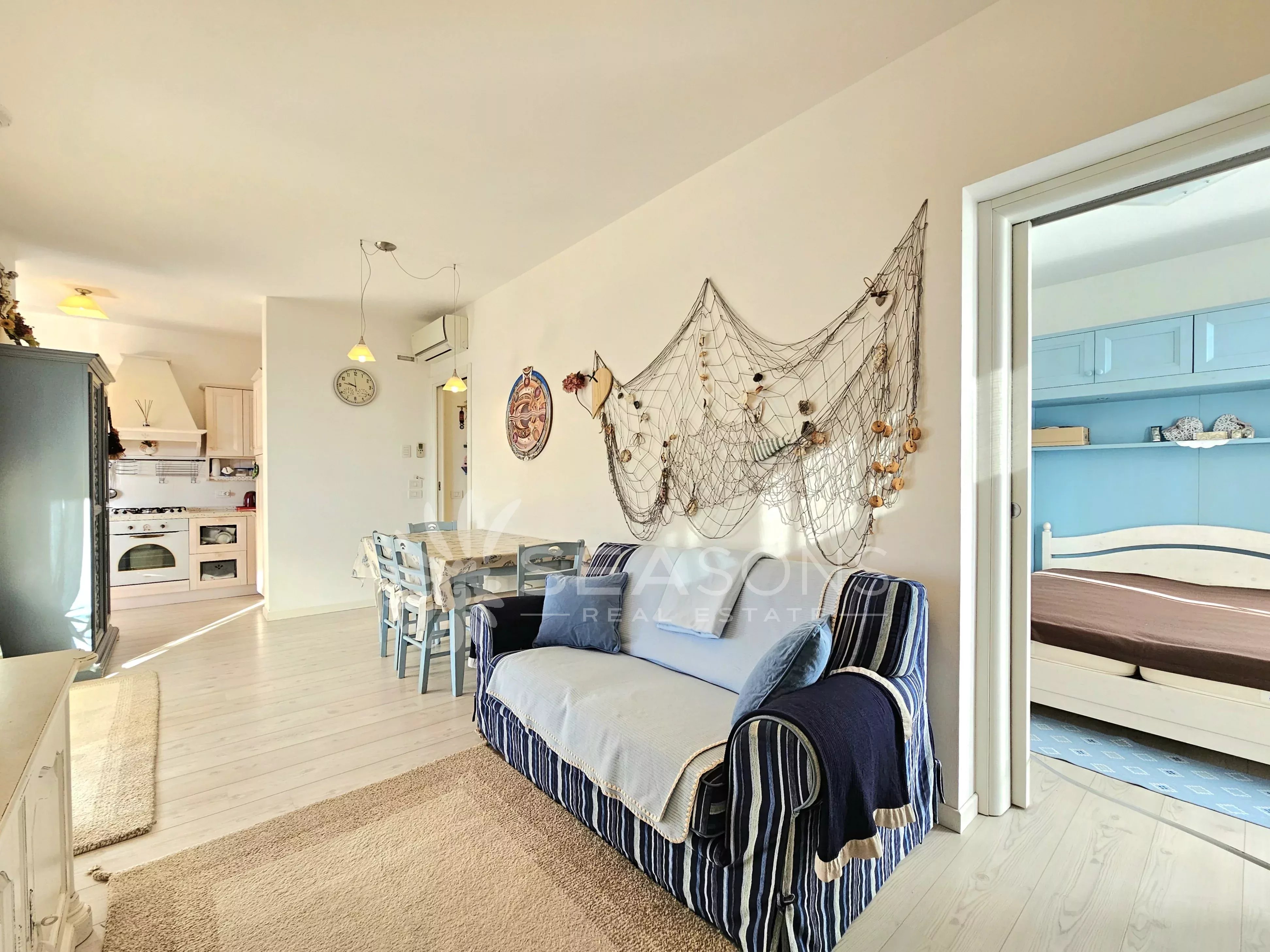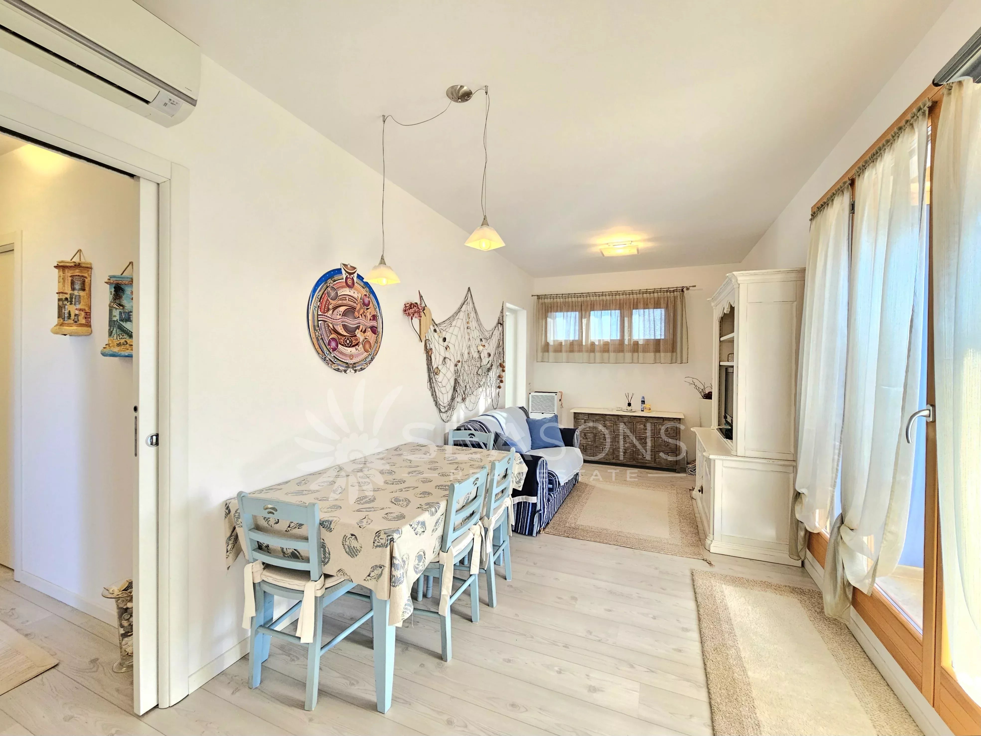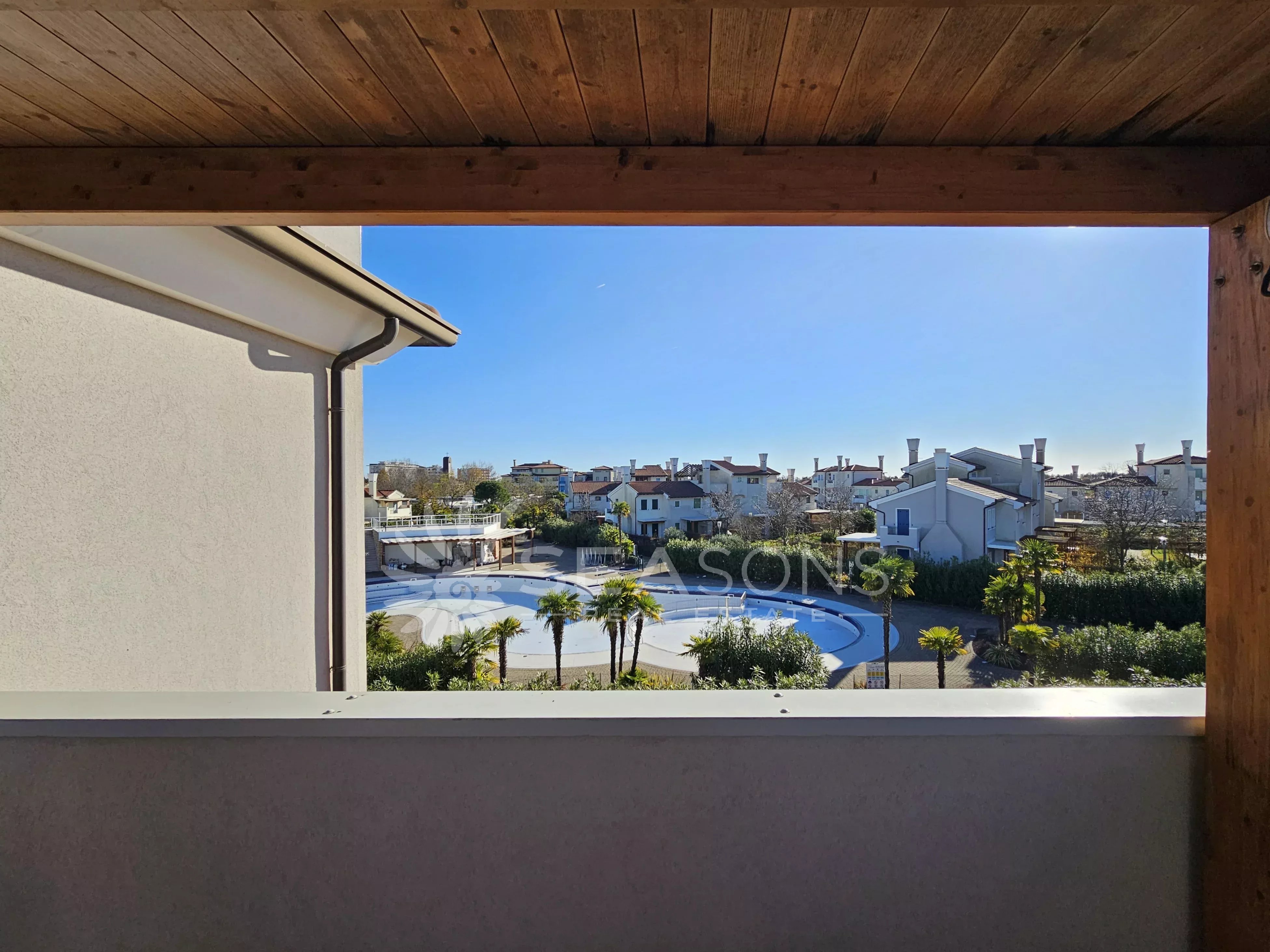 L'immobile si trova in ottime condizioni ed è composto da soggiorno con cucina semi separata collegato alla comoda e grande terrazza con vista piscina, disimpegno, due camere da letto, due bagni;